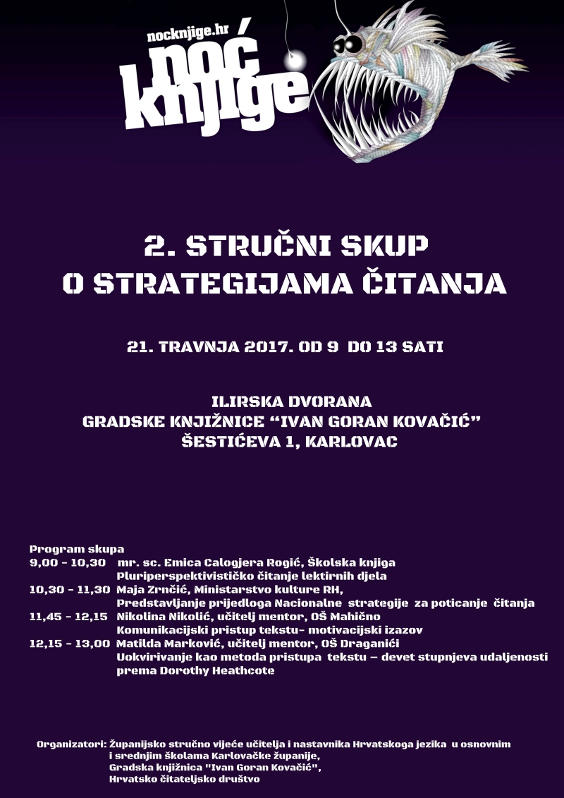 Pozivamo vas na 2. stručni skup posvećen strategijama čitanja kojeg u suradnji organiziraju Županijsko stručno vijeće učitelja i nastavnika Hrvatskoga jezika u osnovnim i srednjim školama Karlovačke županije, Gradska knjižnica “Ivan Goran Kovačić” te Hrvatsko čitateljsko društvo. Skup će se održati 21. travnja 2017. od 9 do 13 sati u karlovačkoj knjižnici povodom manifestacije Noć knjige.